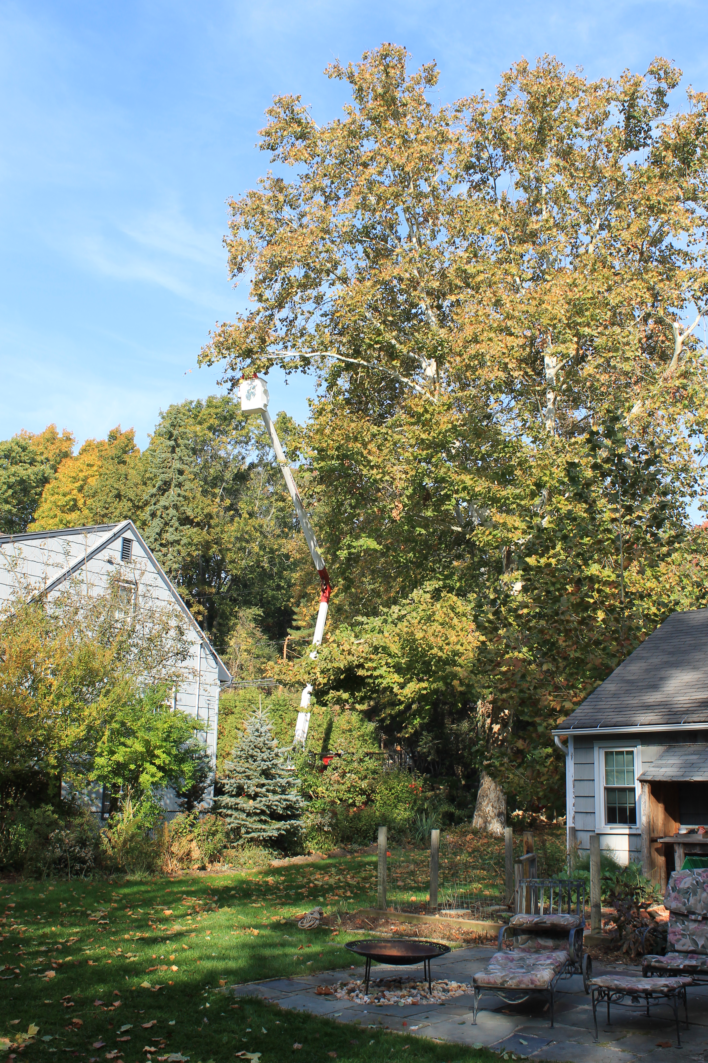 Workers in a cherry picker trim the branches of the sycamore on my property that hang dangerously over by neighbor’s house.