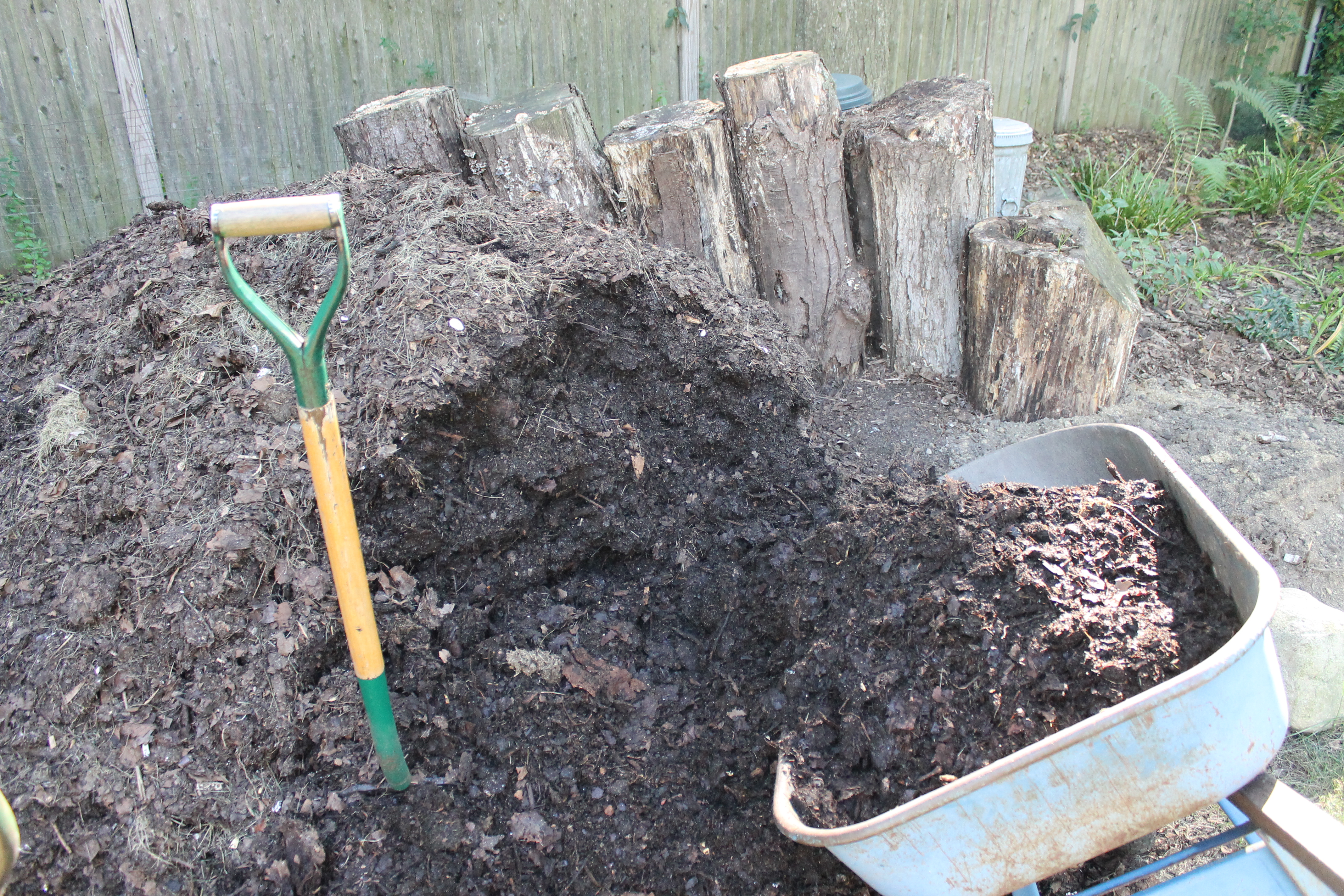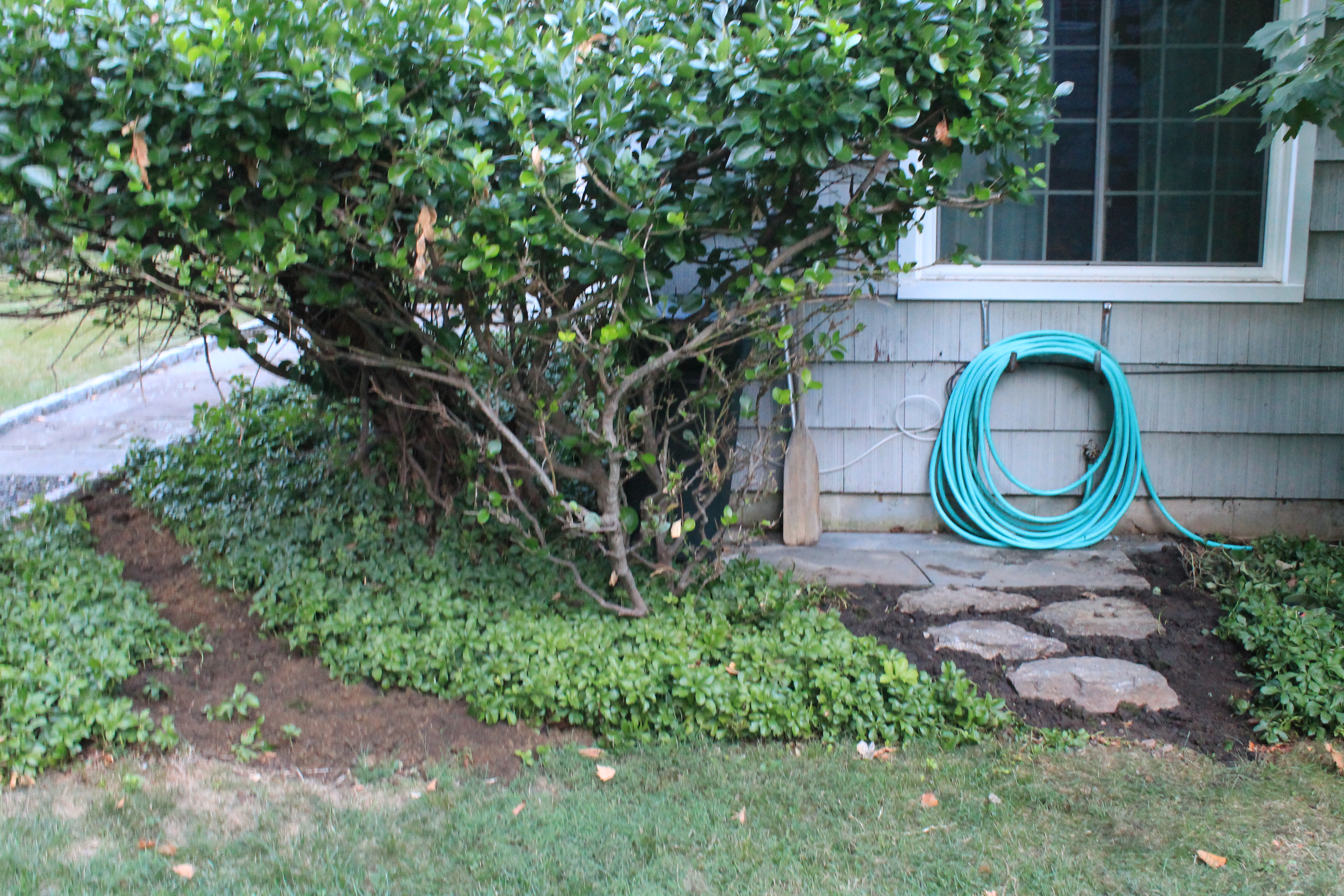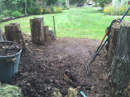Compost helps fill in around the stone steps leading to the water hose and garbage can, as well as the track the dog has made through the pachysandra.